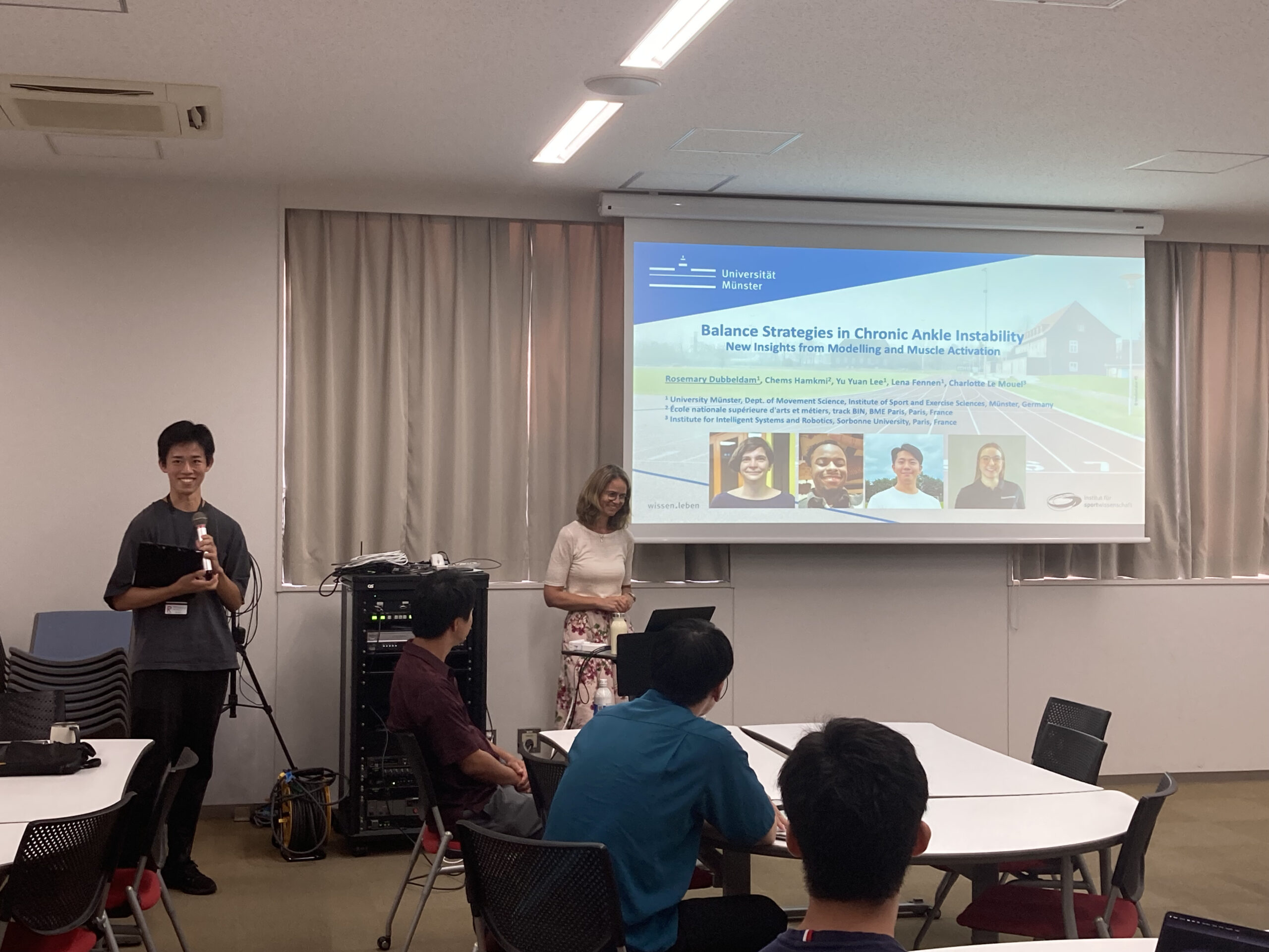 本セミナーでは、ドイツ・ミュンスター大学のローズマリー先生をお招きし、慢性足関節不安定症(CAI)既往歴のある被験者のバランストレーニングや股関節筋力の影響について、研究内容と成果をご発表いただきました。