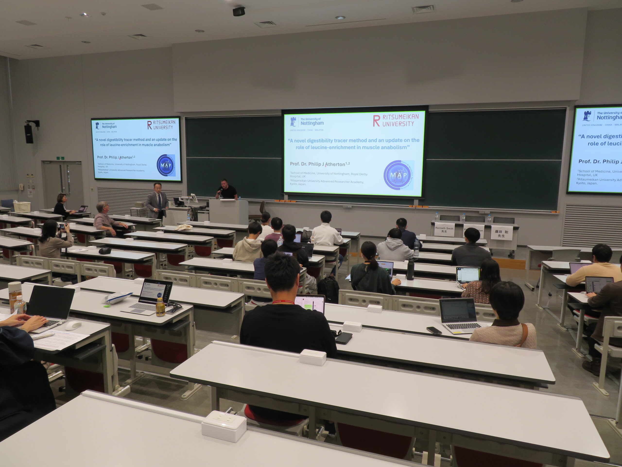 Atherton先生からは、食事から摂るたんぱく質が体でどのように消化・吸収されるか、そしてロイシン(必須アミノ酸の一種)を十分に含めることが筋肉作りにどう効くかについて、分かりやすく解説頂きました。Smith先生からは安定同位体トレーサー法という安全な“マーカー”を使って、骨格筋のたんぱく質やアミノ酸が体の中でどれくらい作られ・壊されているかを測る新たな手法と、その成果をご発表いただきました。