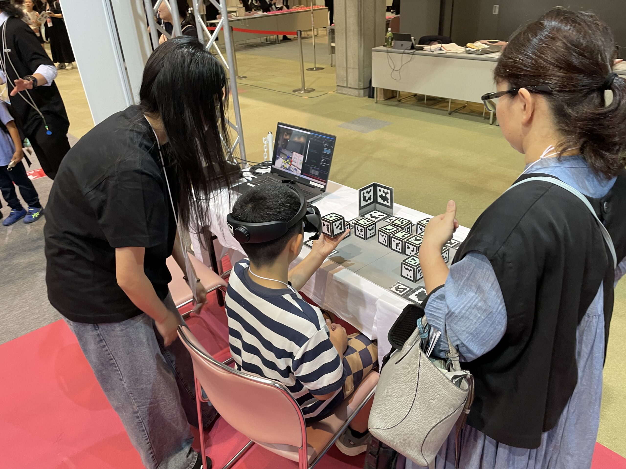 本ブースでは、研究室で作成したオリジナルのVR・MR、ARのコンテンツをヘッドマウントディスプレイを装着して体験でき、お子様からお年寄りまで幅広い世代の方々がデモンストレーションできる空間にしました。